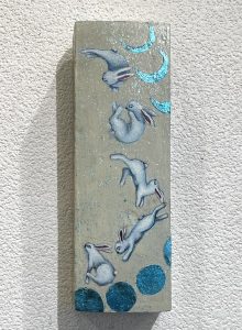 たてぐちけいこ 兎と月 /2022年制作 古材・箔・アクリル絵具 /SOLD 売約済み