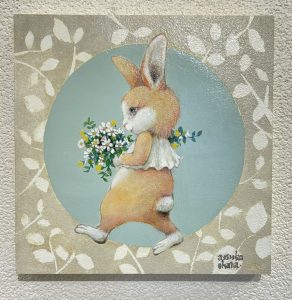 おおはらあつこ 花とうさぎ 2022年制作 パネル・ジェッソ・アクリル・色鉛筆 ¥12,100-(税込)