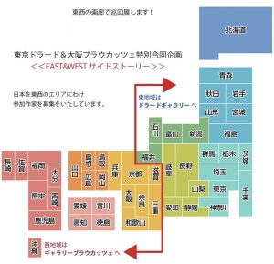 今回、日本を東西にわけて、添付の地図より東の方はドラードギャラリー へ、西の方はギャラリーブラウカッツェに、それぞれのギャラリーに作家25名が集います。