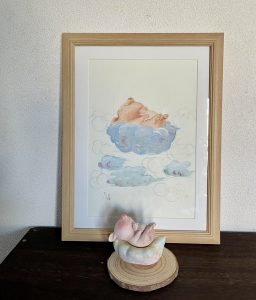 ©︎中谷理恵 (絵画)雲のベッド A4サイズ(水彩紙、アクリル)/ (造形)こぶたのベッド 70×90mm (石塑粘土、アクリル)/SOLD売約済み
