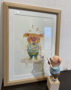 ©︎中谷理恵 (絵画)歌うこぶた A4サイズ(水彩紙、アクリル)/(造形)歌うこぶた 50×160mm(台座込み) 石塑粘土、アクリル/