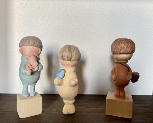 ©︎中谷理恵 (左)びーびとこぶた 35×40mm(台座込み)石塑粘土、アクリル/ (中)びーびと青い鳥 40×120mm 石塑粘土、アクリル/ (右)びーびのどんぐりポシェット 50×140mm(台座込み) ヒノキ木彫、アクリル/