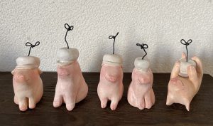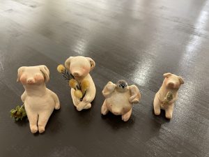 ©︎中谷理恵 (左)お花こぶた ※左より2点目:売約済み /こぶたと雀 / つくしんぼ 売約済み/全作品(陶器、アクリル)