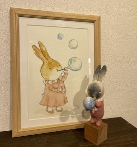©︎中谷理恵 (絵画)シャボン玉飛んだ A4サイズ(水彩紙、アクリル)/ (造形)しゃぼんうさぎ (石塑粘土、アクリル)