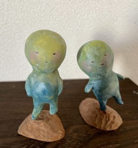 ©︎中谷理恵 ミニムーン (台座込み左45×100/ 右60×90mm) 石塑粘土、アクリル、木