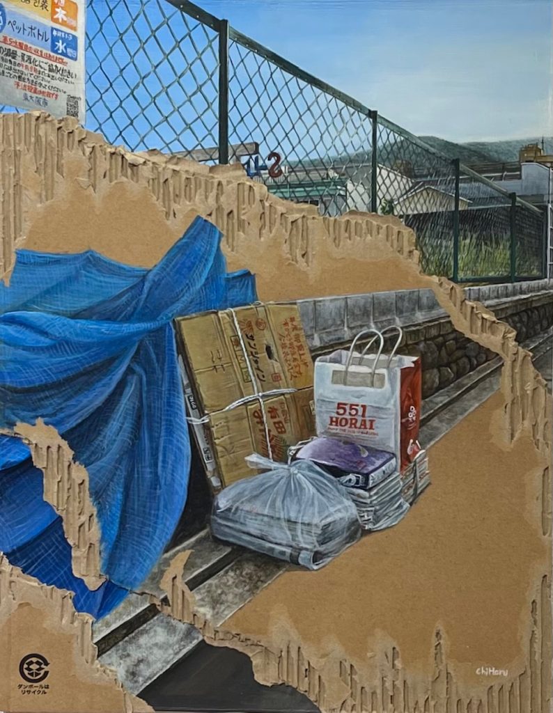 ChiHaru「さよならまたね」(アクリル・ジェッソ・段ボール・木製パネル/2024年制作) ¥110,000-(税込)