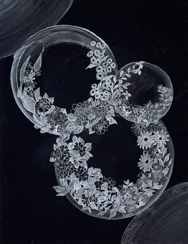 はやしふみえ「流るる」(アクリル・ペン・顔彩・ラメ/2024年制作) ¥35,200-(税込)