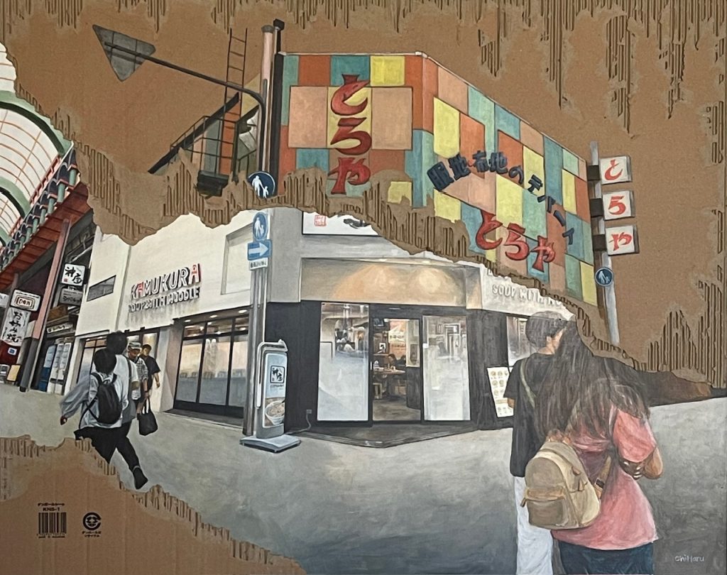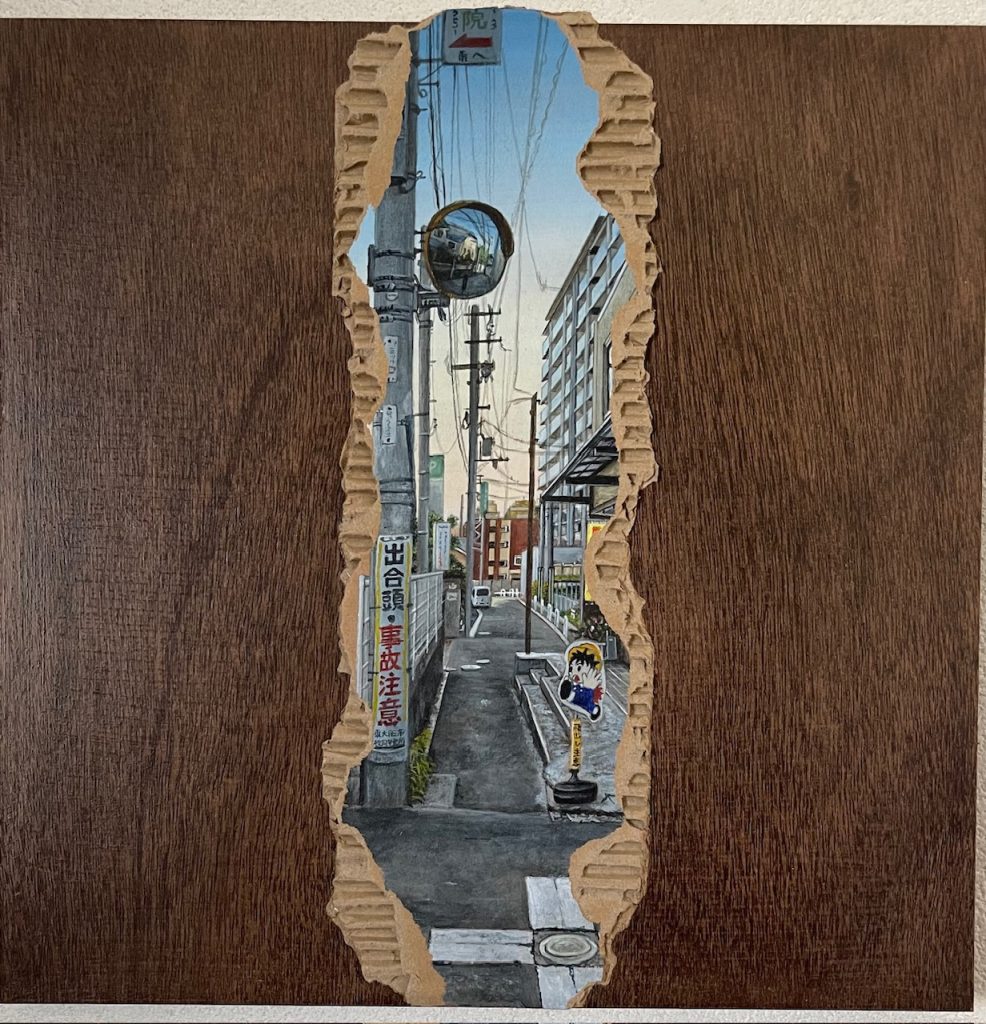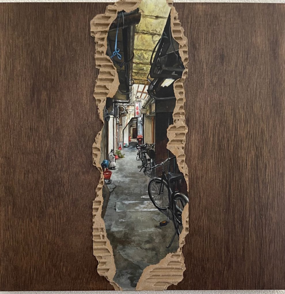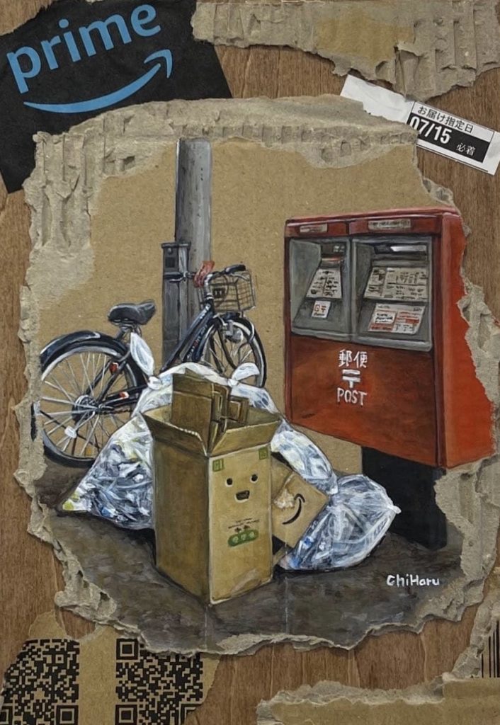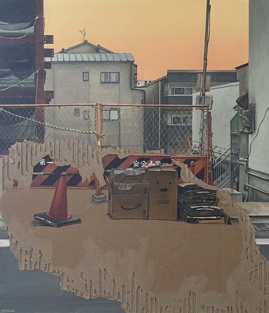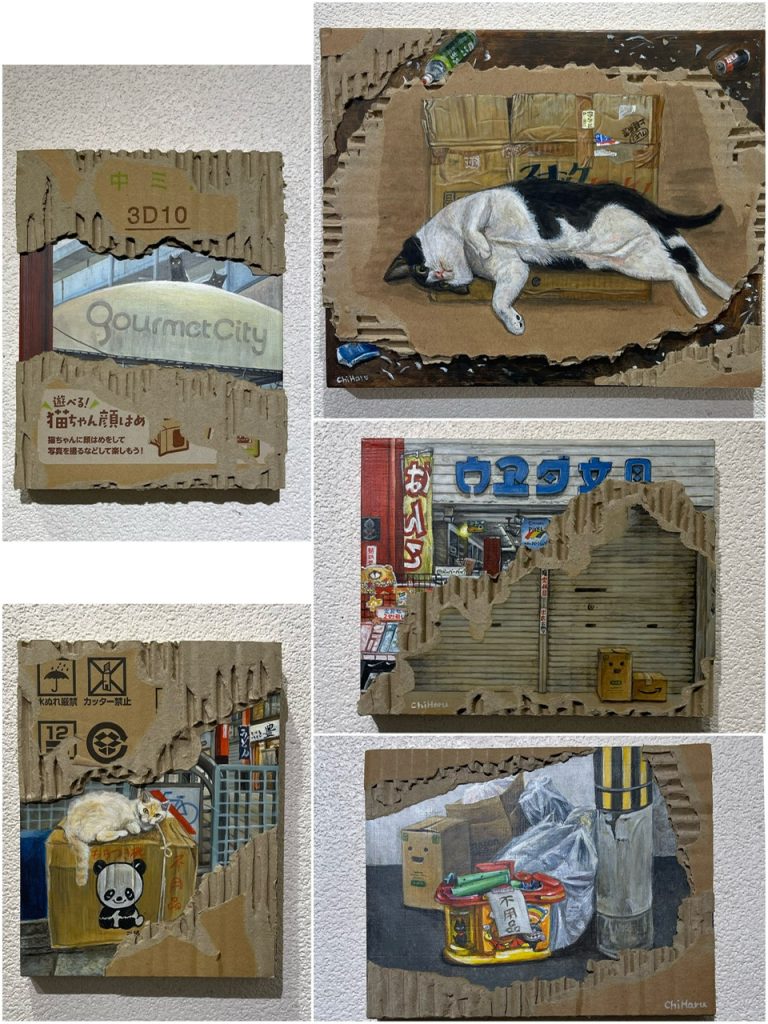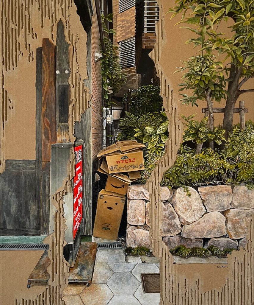 ChiHaru作品は、1枚の絵の中に時間が混在し、また覗き見るような、歪んだ時空間に放り込まれるような、不思議な感覚にさせられます。それは丁寧に描き込まれた描写力、段ボールの使い方のセンスの良さが成せる技です。そして絶妙なタイトルのネーミングセンス!絵画の答え合わせがそこに在るようです。