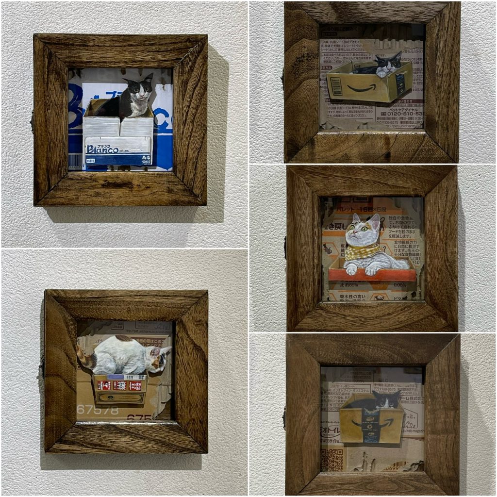 ハコネコシリーズ/180×180mm/アクリル絵具・段ボール・自作額付き/ ※アクリル板入りのため写り込みあります。 〇ハコネコ12(左上)SOLD売約済み 〇ハコネコ10(右下)SOLD売約済み ◯ハコネコ5(左下)SOLD売約済み