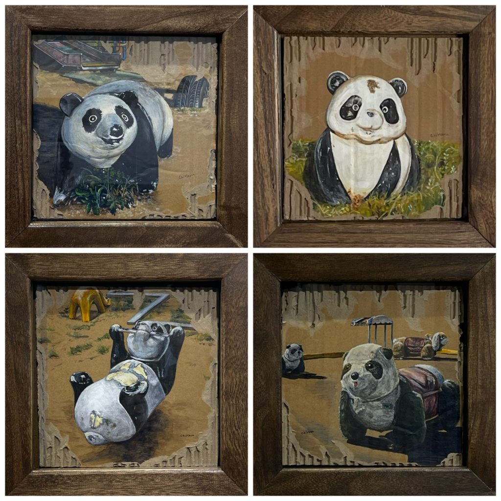 PANDA PANDA シリーズ アクリル絵具・段ボール・自作額付 200×200mm(額サイズ273×273mm)/(左上)公園パンダ (左下)団地パンダ (右上)空地パンダ (右下)遊園地パンダ