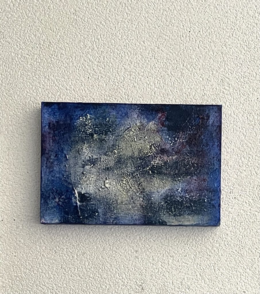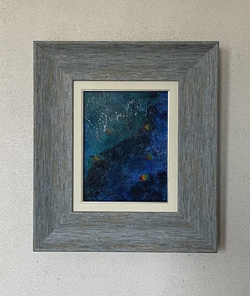 五感で感じた光景を視覚化し、抽象と具象が織りなす心象風景に変えて作品にします。アクリル、オイル、メディウムを重ね、そして削り出し磨く混合技法による絵画です。