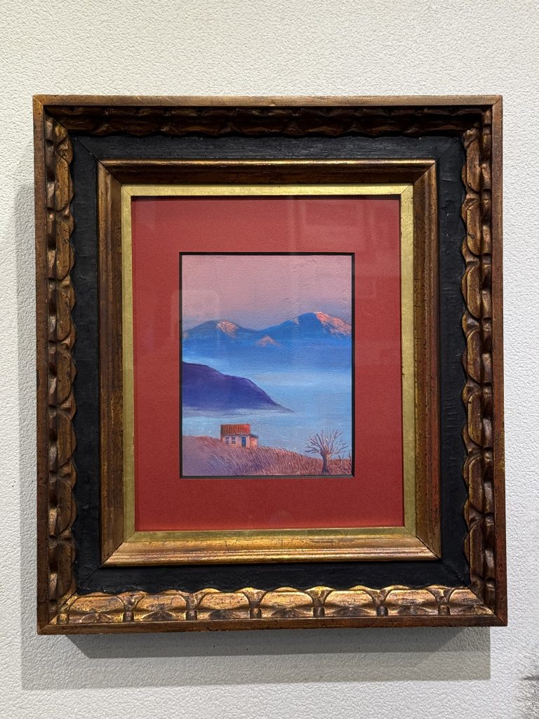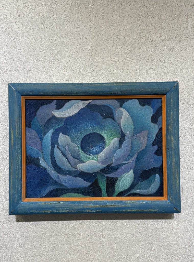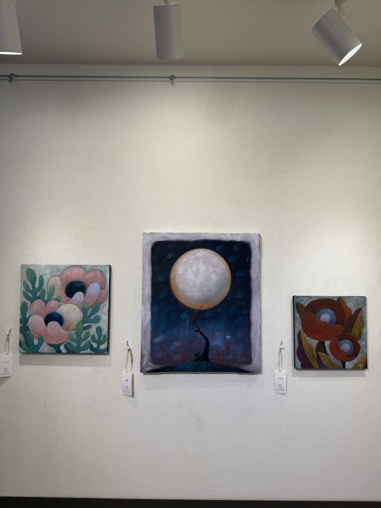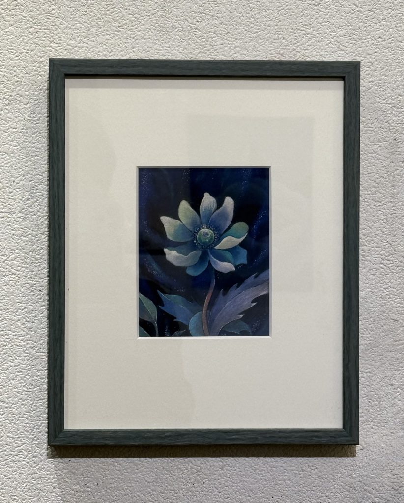 描かれた花の芯には宇宙が描かれていて銀河が見えます。そして全ての作品には、光と影、その対比が描かれています。けれど決して、強く差し込む光ではなく、穏やかな光を感じ、いつまでもその世界の中に入り込み、観ていられる作品なのです。