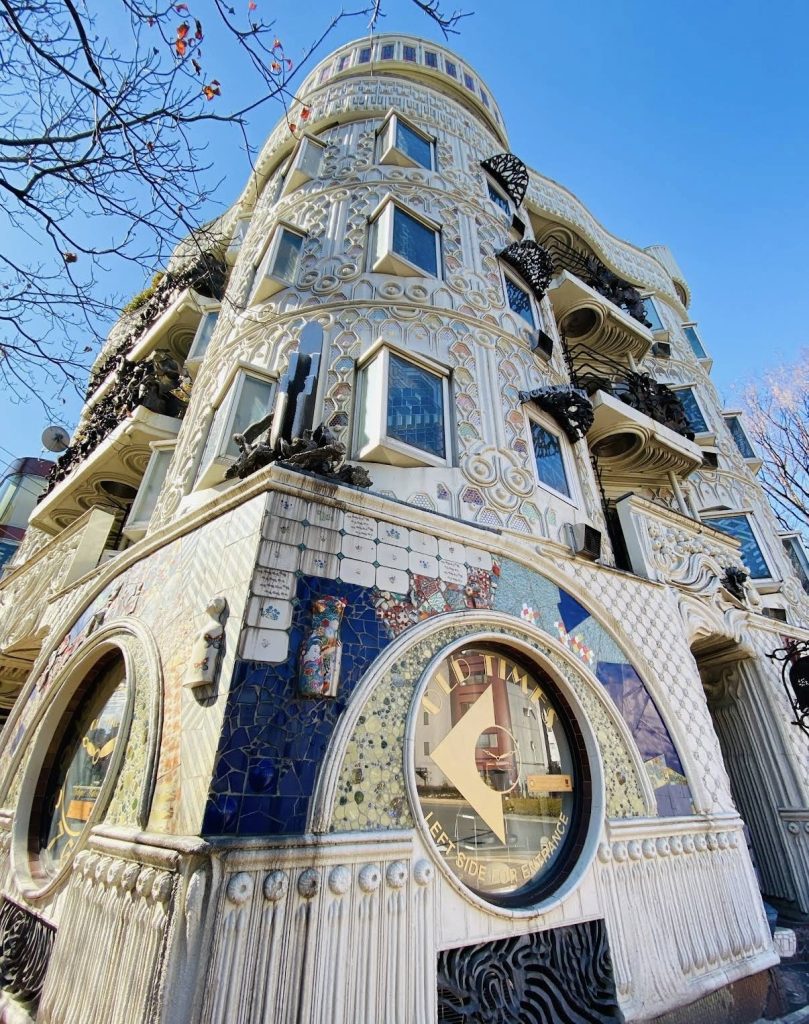 街中でひときわ異彩を放つ建築物。デコレーションケーキのような外観と、内部に現れる巨大な「手」の彫刻。その設計は「日本のガウディ」と称される建築家・梵寿綱氏。その1階にあるドラードギャラリー、サロンはドラマや雑誌の撮影などに使用されることもある。